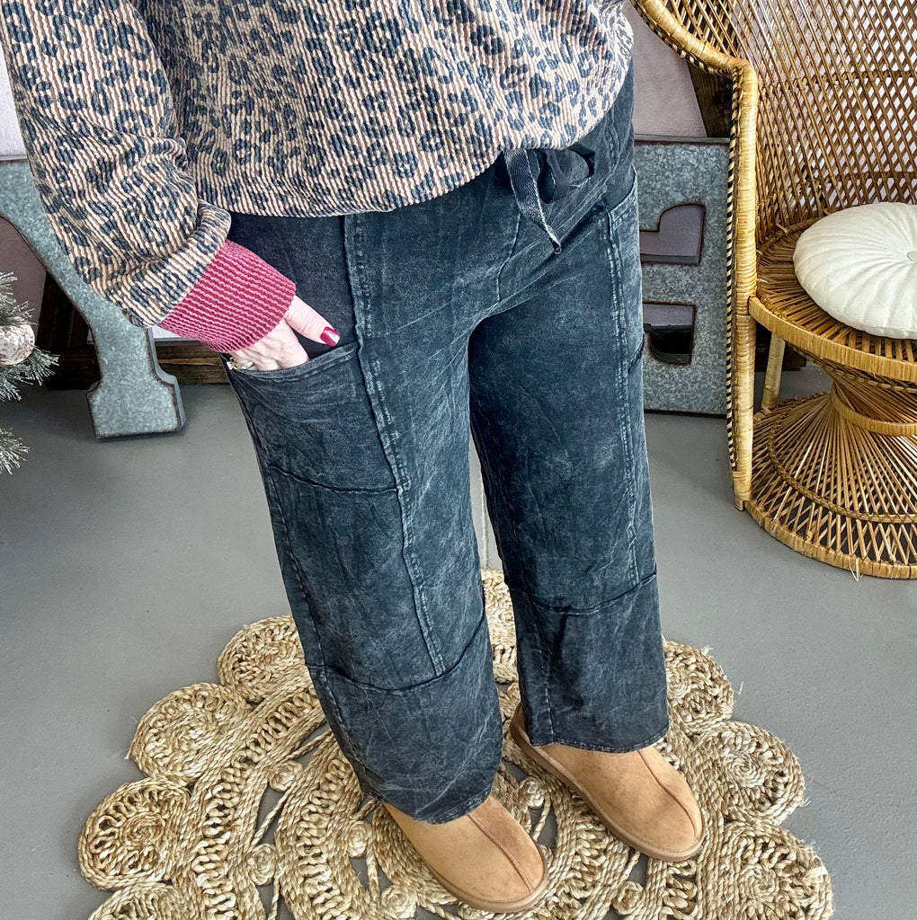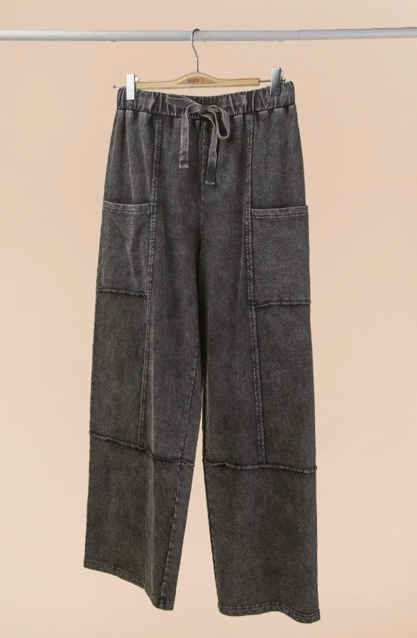 Slip into effortless comfort with these mineral-washed wide-leg pants that feel as good as they look. The elastic waist with drawstring adjusts to your perfect fit, while functional side and back pockets keep your essentials close. Perfect for lounging, running errands, or those days when style meets pure comfort. Casual sophistication has never been this easy. 100% Cotton
